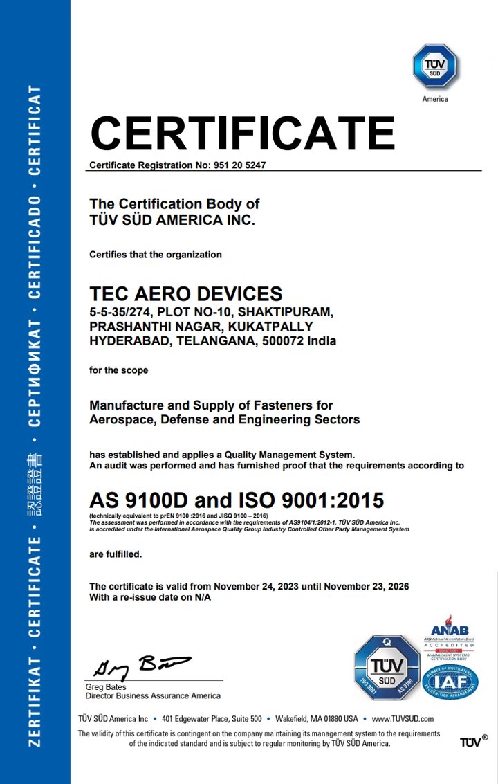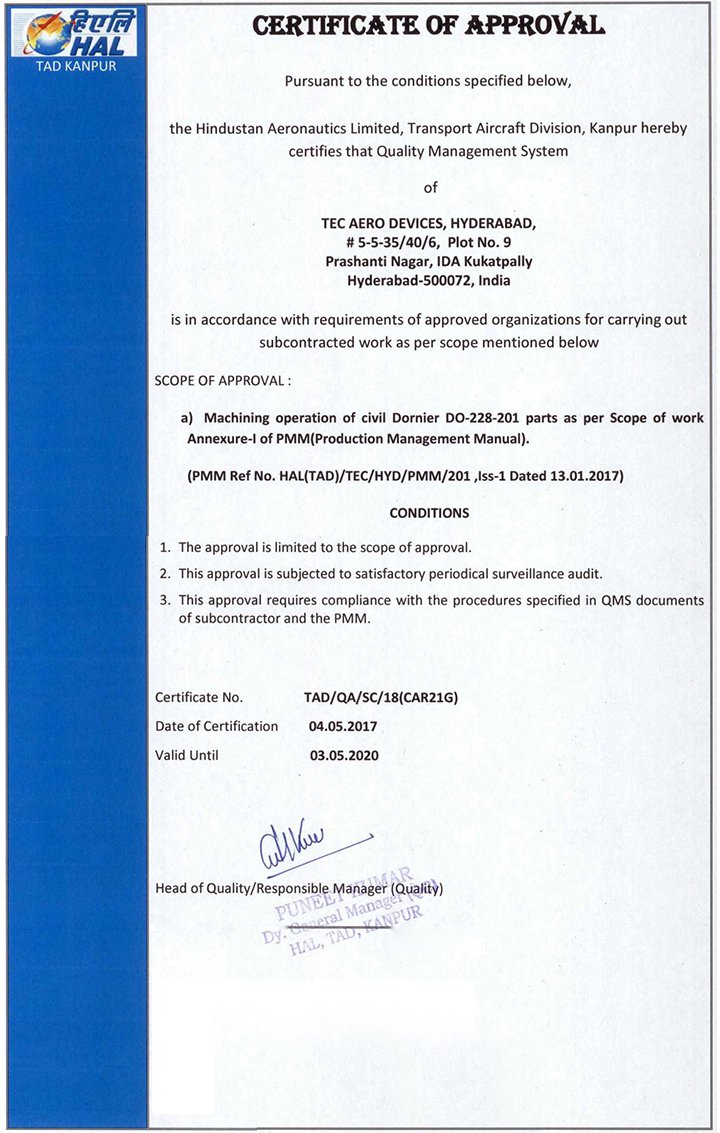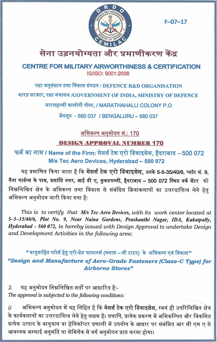 Tec Aero was established in 2013 with first supplier being HAL,. Since then, in 2017 the Company was awarded with the MoD Certification (CEMILAC) for undertaking Design and Development of fasteners for Military aircraft ,helicopters and Missiles